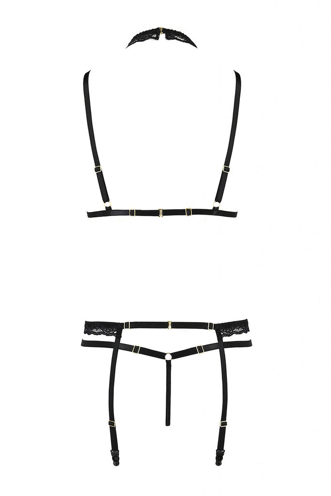 The Shelly set is a composition consisting of a timeless choker, open bra, sensual garter belt and sophisticated thongs. The innovative arrangement of stripes sensually wraps the bust, making the set focus the attention and emphasize the greatest advantages of the female body. Thanks to the adjusters, the height of the stockings can be individually adjusted to suit your preferences. The fine finish is added to the whole with a sensual lace.