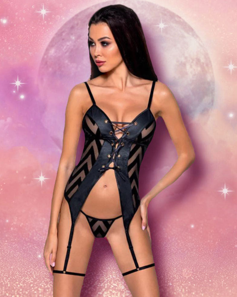 Classic corset lacing, leather and flock? An unusual combination, which results in an unusual Angelica corset. The whole spice is added by adjustable straps encircling the thighs.