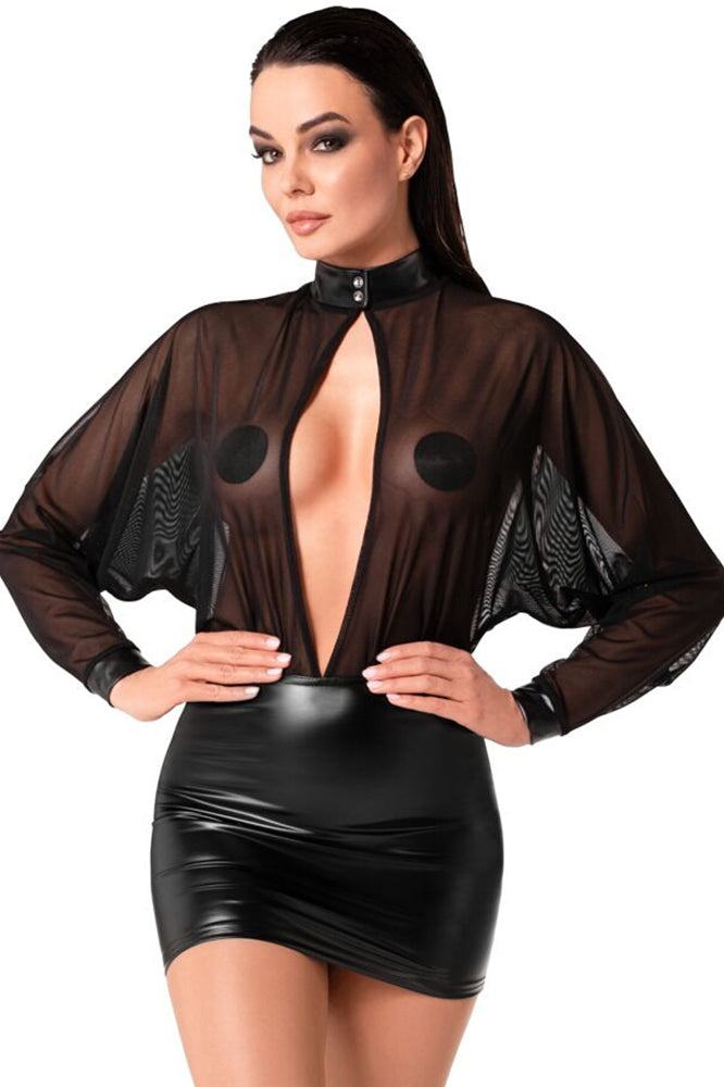 Design: The mesh top features a snap-button collar and cuffs made from the same Wetlook fabric as the skirt, tying the two elements together. The open back and plunging front add an edgy twist to the elegant design, making it perfect for both daring outings and intimate settings.