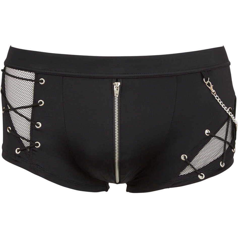 Stylish and masculine! Pants made out of a trendy combination of opaque and transparent (fishnet) material. With a removable decorative chain and zip at the front. Black. Very stretchy.