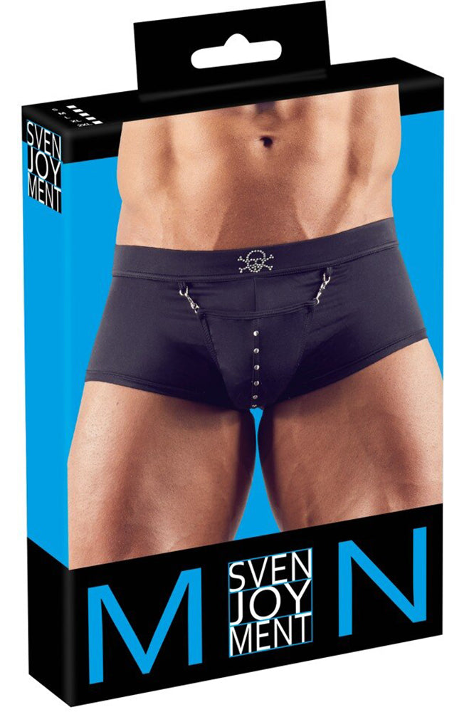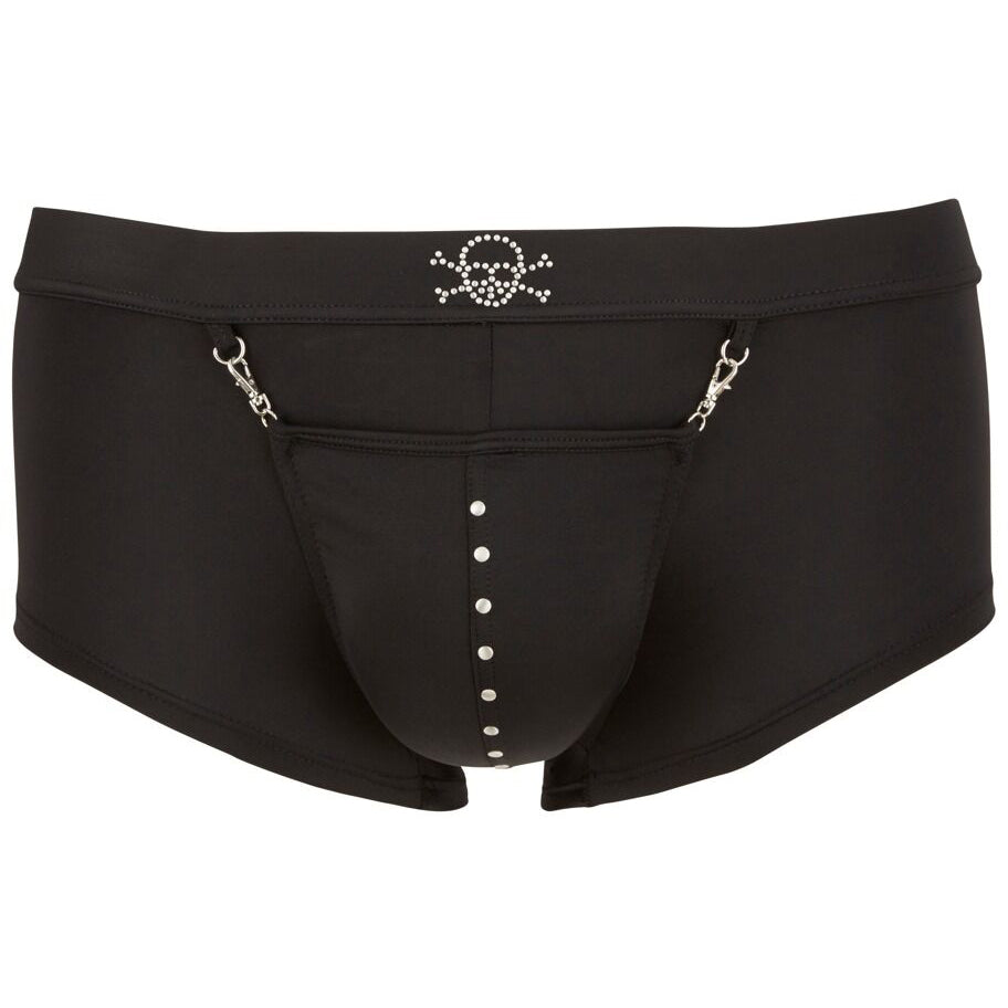Find the treasure! Figure-emphasising pirate pants with a pouch that has snap hooks. With a swell function for an impressive front bulge and an authentic skull on the waistband that is made out of studs. Perfect for wild adventures and hot role play.