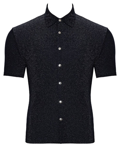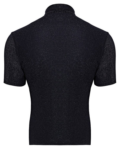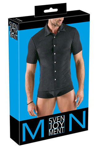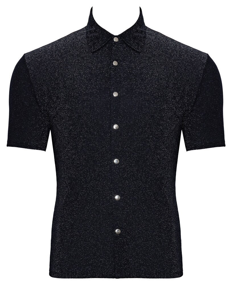 Glamorous and comfortable! The emphasising, tight-fitting shirt from Svenjoyment is in a shimmering, slightly transparent silver-coloured Lurex look. It has short sleeves, a stand-up collar and a row of press studs at the front. It is soft and stretchy for a very comfortable fit.