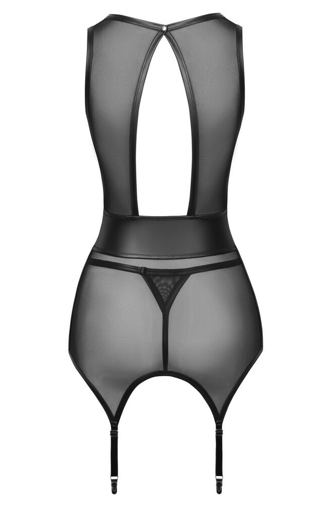 Stylish suspender look! The set from Cottelli LINGERIE contains a basque and string. Everything is made out of black powernet with stylish details that are made out of matte look material. It is soft and stretchy for a very comfortable fit. The basque is very low cut at the front – it goes right down to the matte look waist insert. There are also matte look stripes on the basque which create a beautiful silhouette. It is also low cut at the back as well. There is a press stud fastener at the back of the neck. The suspender straps can be adjusted to fit.