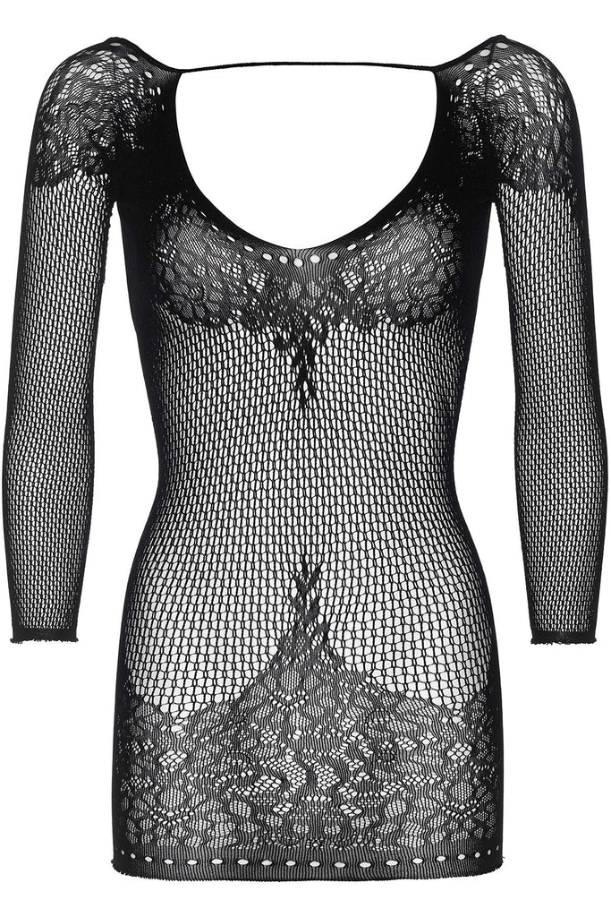 Long sleeved ring net and floral lace low back mini dress.