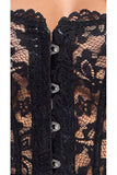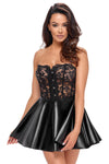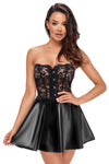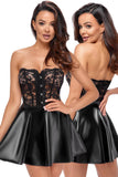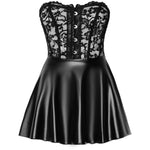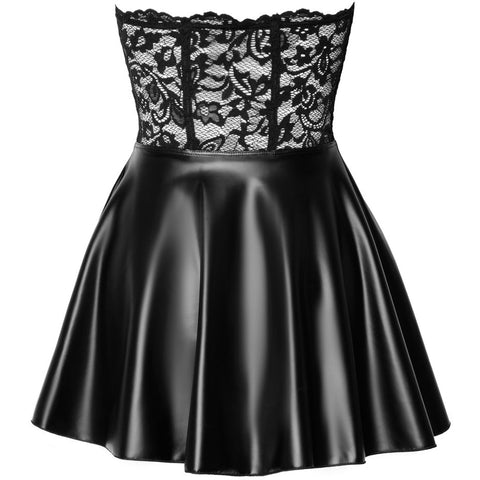 Little black dress in an exclusive style! Short, strapless corset dress by Noir made of delicate lace (top) mixed with powerwetlook (skirt). Soft and stretchy for maximum comfort. Skin-tight corset top with built-in shaping boning and hook fastening at the front. Luxurious matte shimmering skirt with swinging flare.