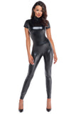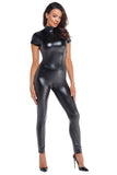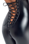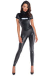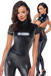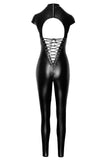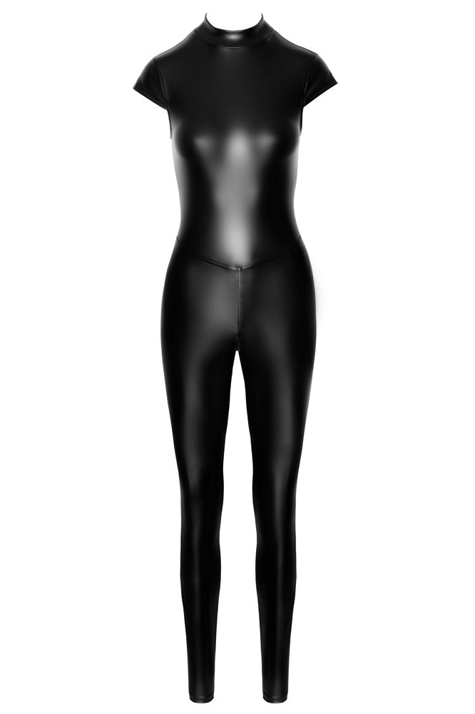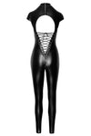 Exclusive style in a snug powerwetlook! Emphasising jumpsuit by Noir in black powerwetlook – fits like a second skin. Soft and stretchy for maximum comfort. Close-fitting style with stand-up collar, short sleeves and long legs. With hook fastening at the neck. Underneath a large neckline and an open adjustable lacing up to the bottom. In the crotch with 2-way zip – practical and seductive at the same time!