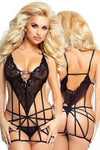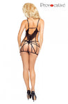A very sexy and original design made from delicate and impressive lace. The chest is covered with a soft and silky fabric decorated with a floral motif. This chemise is merged with a strappy bottom. All the straps can be adjusted. The front of the chemise is open at the chest with tied ribbon, and the back of the chemise is open. Two bows also feature on the straps at the top of the chemise. Matching thong is included. This item arrives packaged in a lovely Provocative box.