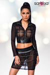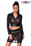 The Saresia Gogo Set with Skirt is a masterpiece of fetish fashion, designed to captivate and tantalize. With its daring combination of wetlook material and transparent mesh, this set is a must-have for any woman who dares to be different.