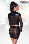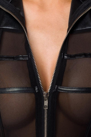 The intricate lattice structure adds a touch of rebellious edge, while the transparent mesh panels reveal just enough to tease the imagination. The short jacket with long sleeves and metal zipper at the center front exudes a sense of authority, while the transparent mini skirt adds a playful touch of flirtation.